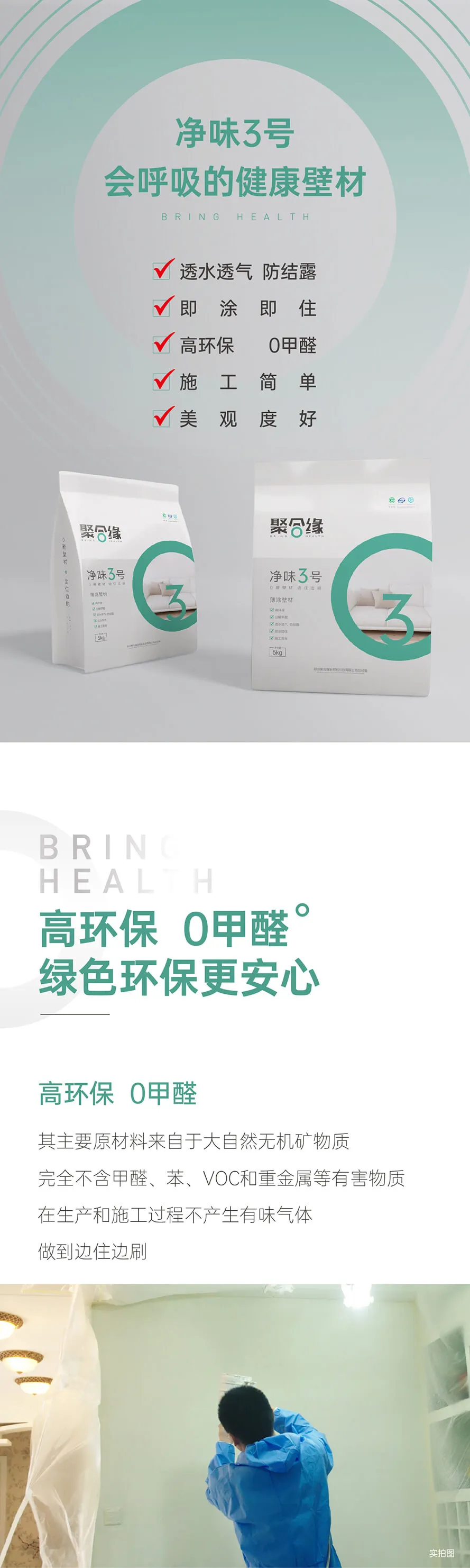 产品介绍:“聚合缘”GJZ02型无醛漆是一种新型环保干粉涂料,其主要原材料来自于大自然的无机矿物质,完全不含甲醛、苯、VOC和重金属等有害物质,是一款真正意义上的零污染环保涂料。产品中掺加的纳米材料在可见光照射下能够分解室内空气中的游离甲醛,同时能让墙面色彩持久缤纷靓丽。此外产品