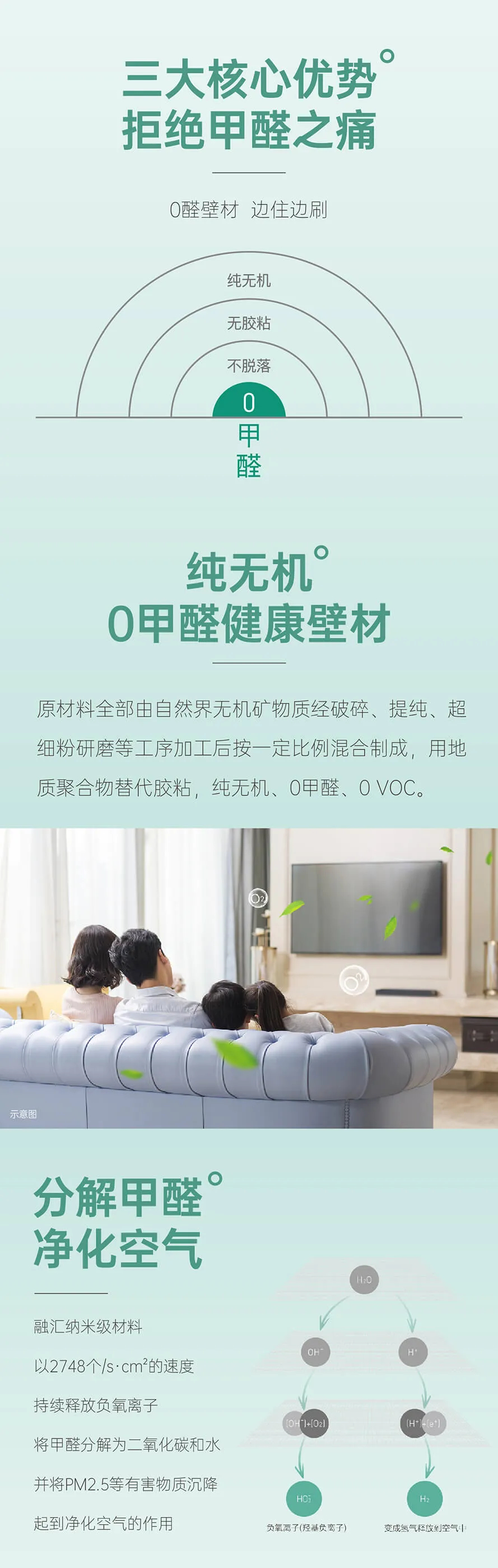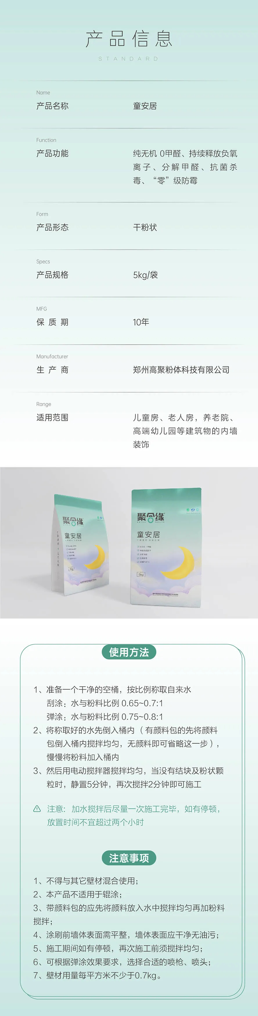 产品介绍:“聚合缘”GJZ02型无醛漆是一种新型环保干粉涂料,其主要原材料来自于大自然的无机矿物质,完全不含甲醛、苯、VOC和重金属等有害物质,是一款真正意义上的零污染环保涂料。产品中掺加的纳米材料在可见光照射下能够分解室内空气中的游离甲醛,同时能让墙面色彩持久缤纷靓丽。此外产品
