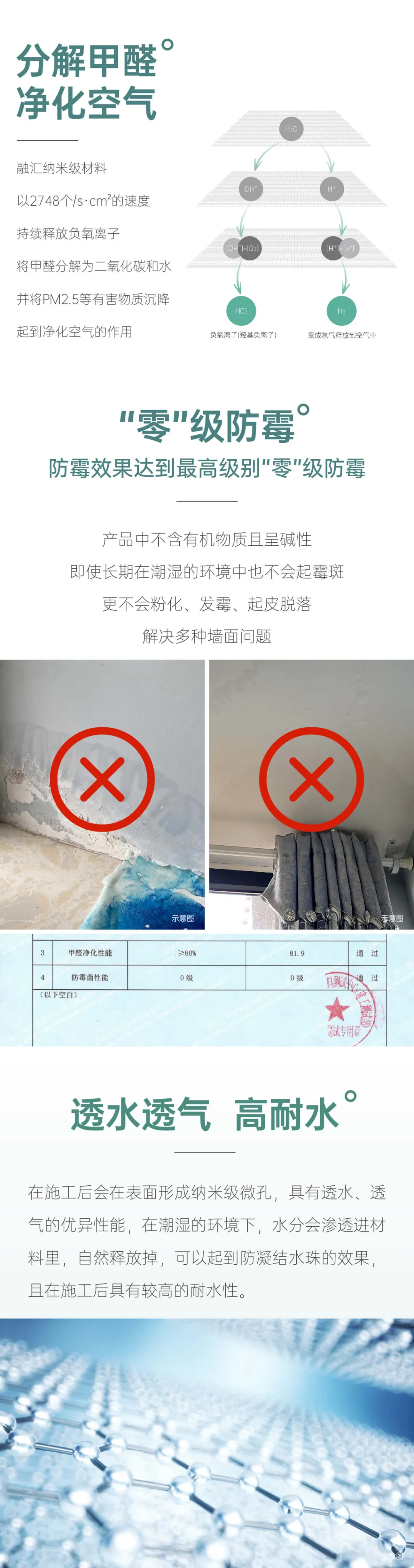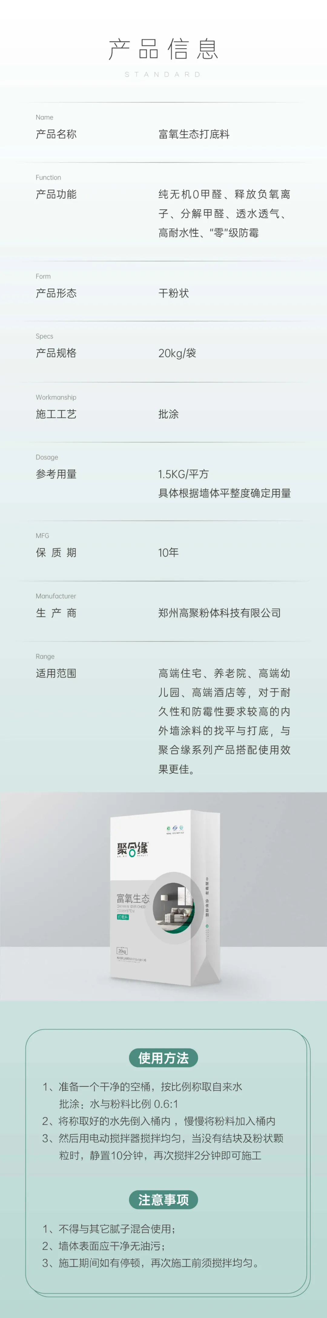 产品介绍:“聚合缘”GJD02型富氧生态打底料是一种纯无机功能型专用打底涂料,其原材料来自于大自然的无机矿物质,产品自身不含甲醛、苯、VOC和重金属,具有超强的耐水、防霉、抑菌和隔热隔噪、防火阻燃功能。本产品在生产过程中加入了具有微能量的功能性纳米材料,使得它另外具有了持续释放负